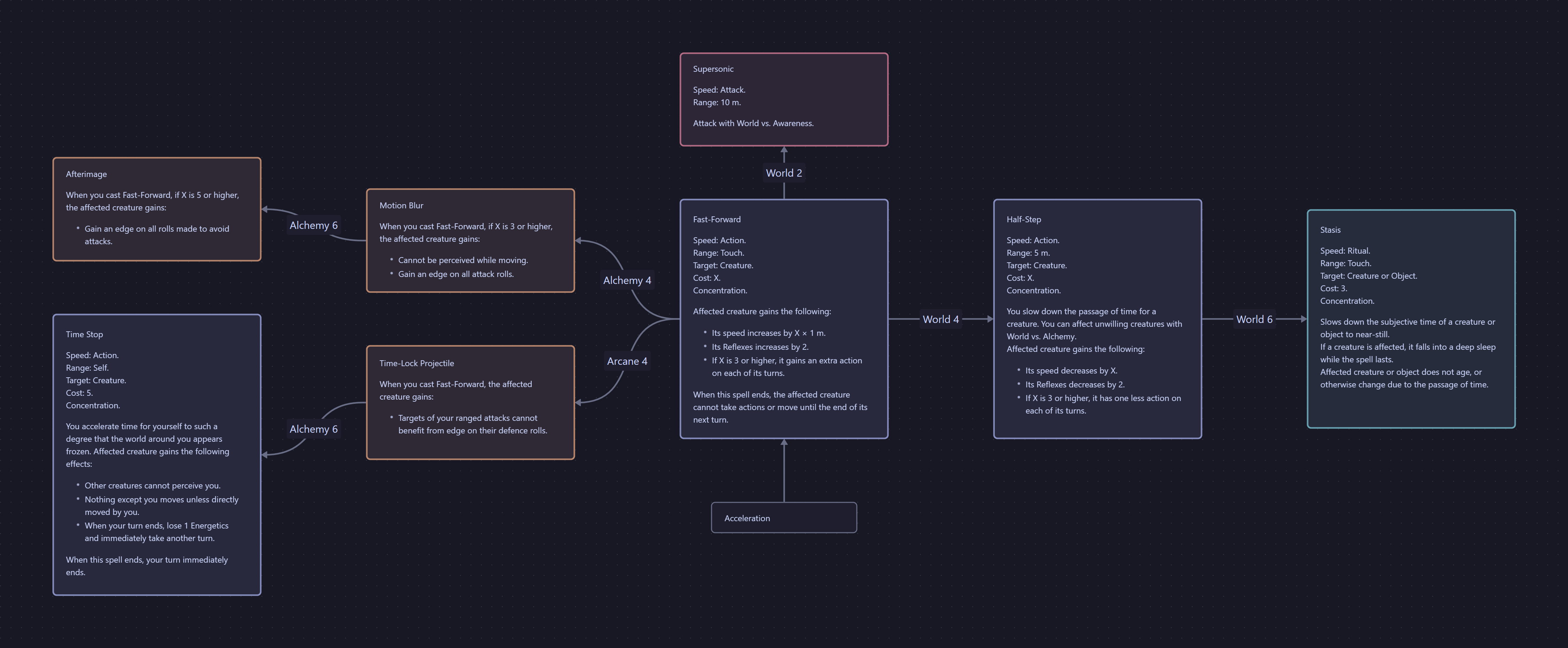 You slow down the passage of time for a creature. You can affect unwilling creatures with World vs. Alchemy. Affected creature gains the following: